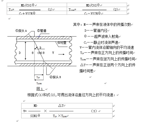 當超聲波束在液體中傳播時(shí),流體的流動(dòng)將使傳播時(shí)間產(chǎn)生微小變化,并且其傳播時(shí)間的變化正比于液體的流速,由此可求出液體的流速。如圖1所示:在待測流量管道外表面上,按一定相對位置安裝一對超聲探頭。安裝方式分為“Z”法和“V”法。一個(gè)探頭受電脈沖激歷產(chǎn)生的超聲脈沖,經(jīng)管壁—流體—管壁為第二探頭所接收。從發(fā)至收超聲脈沖傳播時(shí)間,依其順逆流向分別為: BR>