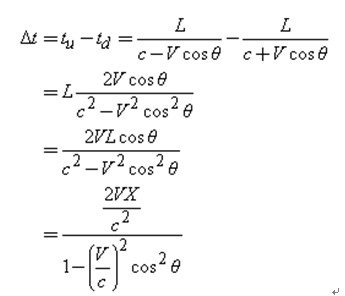 其中:c是超聲波在非流動(dòng)介質(zhì)中的聲速,V是流體介質(zhì)的流動(dòng)速度,tu和td之間的差為: