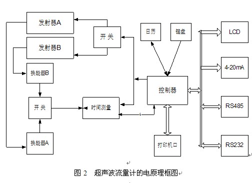 圖2是我們設計的超聲波流量計的原理框圖。圖中主要有兩個(gè)超聲波發(fā)射單元、一個(gè)時(shí)間測量單元和一個(gè)控制器。他們共同來(lái)完成超聲波的發(fā)射、接受和時(shí)間差的測量等工作。其他的外圍單元主要是為了測量?jì)x表的參數設定、測量數據的輸出、顯示和傳送等功能,可參考相關(guān)資料,這里不作介紹。