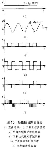 人們開(kāi)始研究電磁流量計時(shí),最先想到使用的勵磁磁場(chǎng)自然是直流磁場(chǎng),后來(lái)又發(fā)明了正弦波交流磁場(chǎng)、低頻矩形波磁場(chǎng)、三值低頻矩形波磁場(chǎng)以及雙頻矩形披磁場(chǎng)等。它們的磁場(chǎng)理想波形如圖7-3所示。