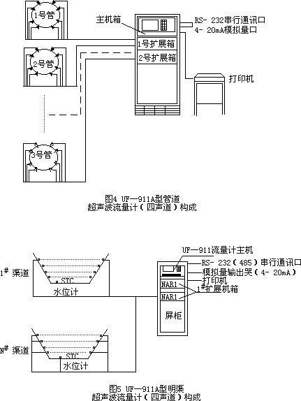 圖4和圖5為UF-911A型超聲波流量計構成示意圖,它由主機箱和裝于被測流道上的超聲波換能器構成。換能器和主機之間用同軸射頻電纜來(lái)傳遞聲信號。一臺UF-911A流量計配置不同數量和類(lèi)型的換能器可測量一條或同時(shí)測量多條管道、渠道。