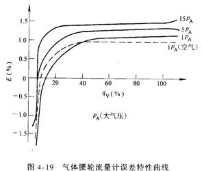 成線(xiàn)性關(guān)系,誤差曲線(xiàn)將隨著(zhù)被測流體密度的增加而向正向移動(dòng)。圖4-19為某氣體腰輪流量計的實(shí)測誤差特性曲線(xiàn),隨著(zhù)工作壓力的提高,誤差曲線(xiàn)向正向移動(dòng)。