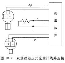 現在有多種智能差壓變送器都能采用通信的方法變更其量程,有些變送器量程可調比高達40倍以上,為多量程流量計的實(shí)現創(chuàng )造了良好條件。如圖10.2所示的雙量程差壓式流量計中,流量演算器與差壓變送器之間的兩根連接線(xiàn)既是變送器電源線(xiàn),又是4~20rnA模擬信號傳輸線(xiàn),同時(shí)承擔HART通信中傳送±0.5mA數字信號的任務(wù)。