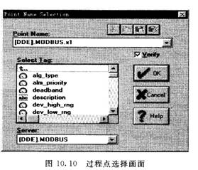 數據顯示:選擇Tool-Toolbars-Dynamic后,按下"485"按鈕,進(jìn)入Point Name Se-lection畫(huà)面(見(jiàn)圖10.10), Server= [modbtis ] . modbus, Point Name= [modbus].modbus, Select Tag=變量名.out。