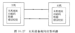 ①通信協(xié)議。數據通信系統協(xié)議控制著(zhù)網(wǎng)絡(luò )內所有設備所共用的語(yǔ)言結構和報文格式,是實(shí)現通信的關(guān)鍵。協(xié)議決定如何建立或中斷主從設備之間的聯(lián)系,如何使發(fā)送和接收裝置協(xié)調一致,如何井然有序地交換報文,如何檢測錯誤。圖10.27所示為協(xié)議控制的主從設備詢(xún)問(wèn)應答環(huán)路。